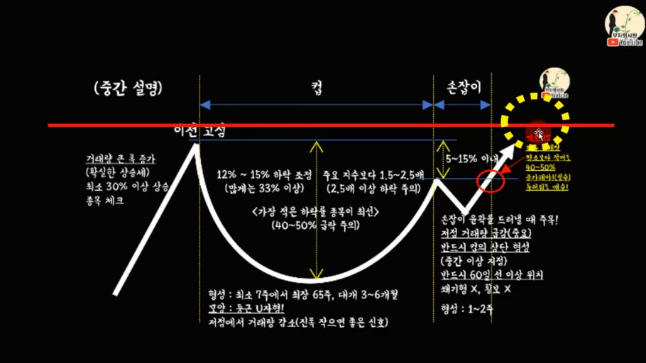 1)맨 왼쪽의 첫번째 상승을 보인 종목 중에서 종목 선정을 하고..(패셔너블하거나 선도하는 업종인지 등)2)눌림목 구간을 거친 후..저가는 길게 상승이 가능.너무 깊으면 탈락 확률이 높다.시장 대비 2.5배 하락까지 허용 등···다양한 조건이다.3)손잡이 생성 중…손잡이의 상한가를 치고 떨어질 때, 거래량 하락이 뒤따라야 한다.파는 사람이 전부 팔아야 나오기 때문에 4)손잡이의 고점을 뚫고 순간이 매수 타점 5)가장 중요한 것은 “손절매:가짜 신호”이었다면 용서 없는 손절 해야 한다.6)잘 샀다고 하면 파는 타점은 손절 라인*1.5배 혹은 성향 상승을 지켜보고 박스권 이탈시에 팔다. 투자가마다 다양한 판매 방법이 있다.(3)는 비교적 좀 적당히 정리했지만···개인적인 결론은 매매 타점은 경험을 통해서 자신만의 노하우를 만들어야 한다는 생각에서다.물론 점진적인 걸어 기계적인 손절고 손절매 라인보다 높은 수익 라인 등 성공 확률을 높이고 기본적인 시스템은 마련돼야 하나.이 책을 통해서 얻은 교훈의 일행”가격이 높은 종목만 인수한다.PER와 주가 상승 사이에는 의미 있는 관련성이 없다”=주식을 시작하고 싼 주식만 사려고 가스 라이팅(?), 세뇌(?) 받은 나의 뇌를 멍하게 한 일행이었다.